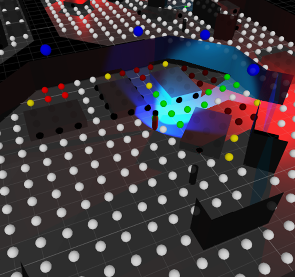The previously built DBSCAN algorithm was added to allow the A.I. to search the environment. The test scene contains a list of positions which the A.I. must search, once every location has been visited the list would be refreshed. Each position contained a set radius – which would be used to generate a DBSCAN of the remaining area. This search would highlight any clusters as new navigation points to be visited before the A.I. can move on to the next area.