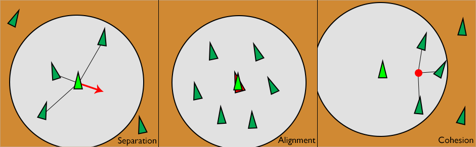 These diagrams are recreated from those shown by Craig Reynolds BOIDS, and show the three basic flocking rules.